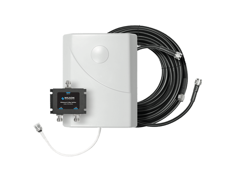 The Wilson Single Antenna Expansion Kit includes one panel antenna, one (2 way) splitter, one length of 60 foot Wilson 400 cable, and one length of 2ft Wilson 400 cable.