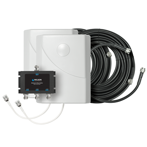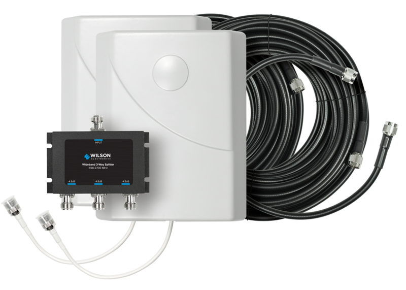 The Dual Antenna Expansion Kit includes two panel antennas, One three way splitter, two lengths of 60 ft Wilson 400 cable, and one 2 ft jumper cable in Wilson 400.