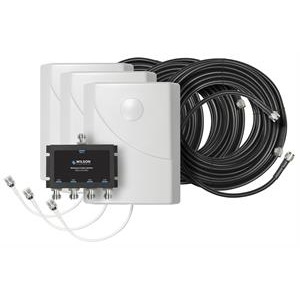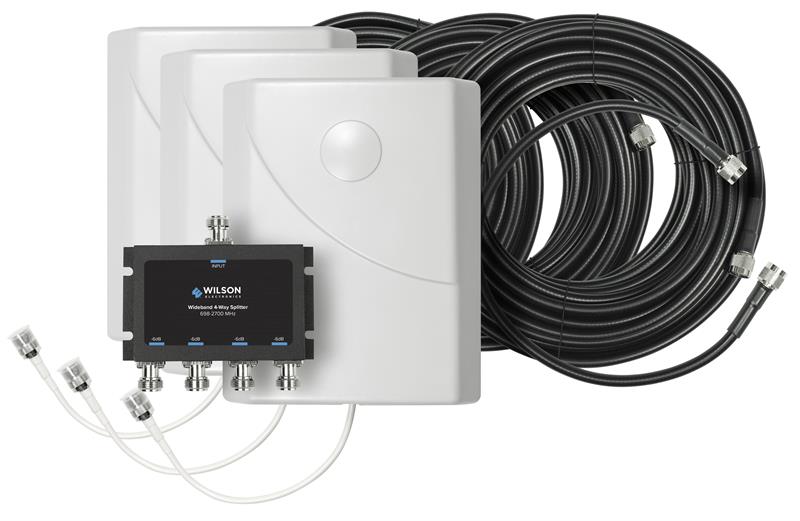 The Triple Antenna Expansion Kit contains three panel antennas, three lengths of 60 ft of Wilson 400, one four way splitter, and one 2ft jumper cable.
