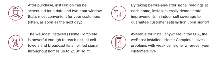 Reliable cellular connectivity at home just got easier with weBoost Installed | Home Complete; the rst product made for the residential market to include professional installation at any address in any U.S. zip code.