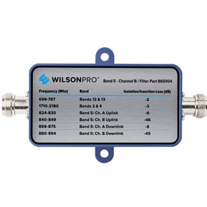 Designed to provide maximum attenuation for Channel B, Band 5, and allow other channels to pass through with minimal attenuation. Channel B includes: Downlink: 880-894 MHz/ Uplink: 840-849 MHz.