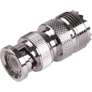 Adapts UHF/Male connector to BNC/Female connector