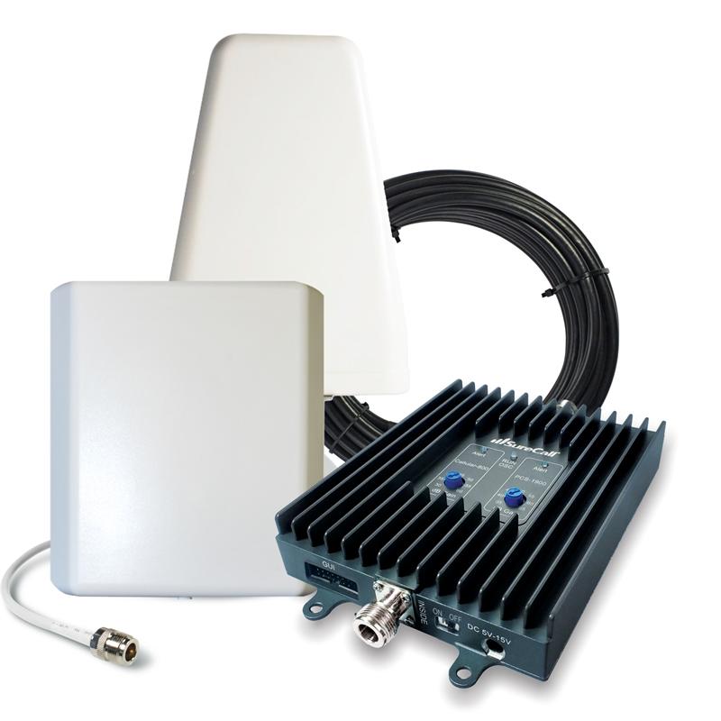 Plug and Play Kit! Includes cable and antennas! Configurable complete In-Building Wireless Dual-Band SOHO Cellular/PCS Amplifier/Repeater kit designed for residential and home offices up to 6,000 sqr feet.