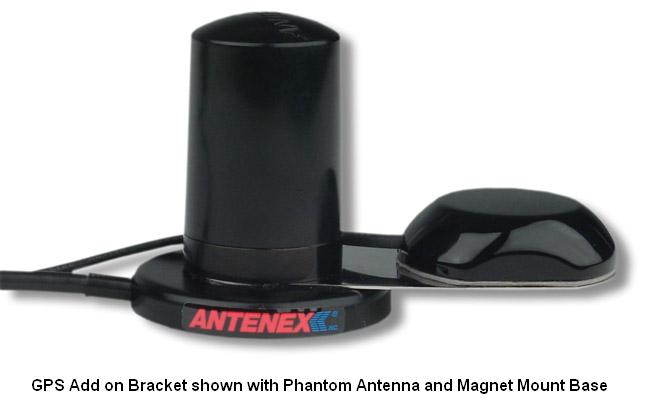 Small, black GPS Antenna with bracket that attaches between radio antenna and NMO mount