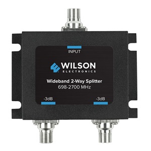 2 Way Splitter, 75 Ohm with F Female Connectors. -3 dB, 700-2700 MHz. For use in signal distribution systems to split the amplified signal with minimum signal loss. Equal amounts of signal sent to multiple antennas for similarly sized areas.