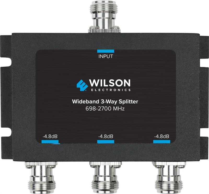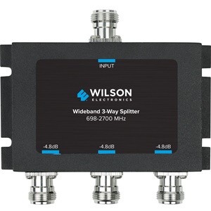 3-way splitter, 50 Ohm with N-Female connectors. Used with WilsonPro cellular repeaters to split a signal into 3 equal parts. Allows 3 antennas to be run from a single cable and receive similar signal strength with minimum loss.