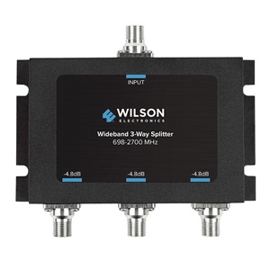 3 Way Splitter, 75 Ohm with F Female Connectors. -4.8 dB, 700-2700 MHz. For use in signal distribution systems to split the amplified signal with minimum signal loss. Equal amounts of signal sent to multiple antennas for similarly sized areas.