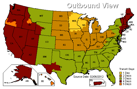 The map below shows estimated transit time (in business days) for UPS Ground shipments from our location. We also offer UPS Next Day Air, Next Day Air Saver, 2nd Day Air, and 3 Day Select.
